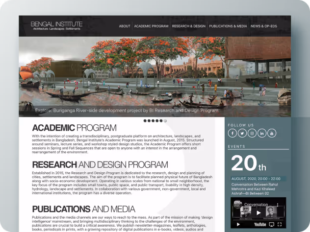 The Bengal Institute for Architecture, Landscapes and Settlements is a transdisciplinary think-tank in Dhaka, Bangladesh, dedicated to environmental study and design. Its web portal showcases the organization's extensive range of post-grad academic programs, research, publications, events, and media resources.